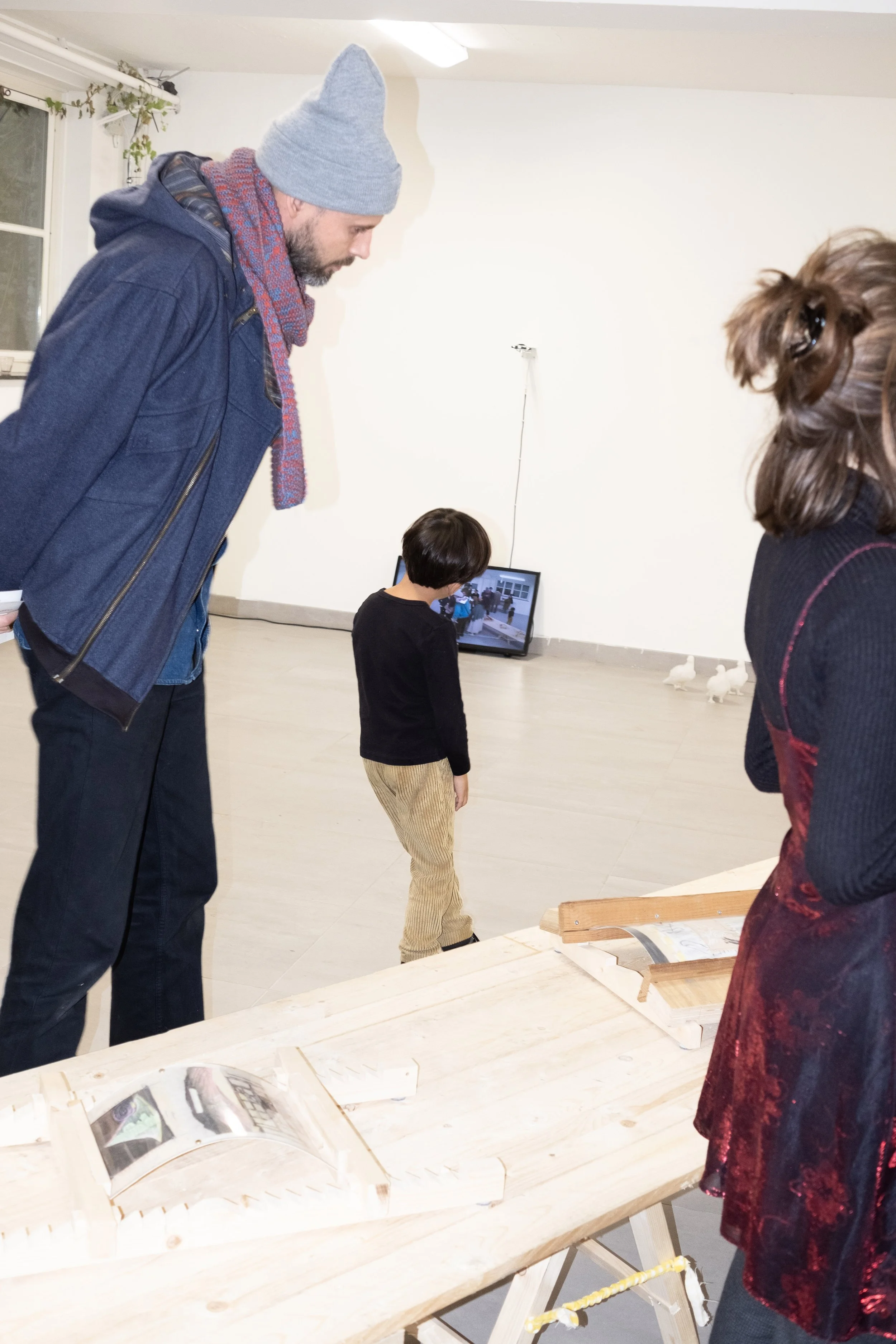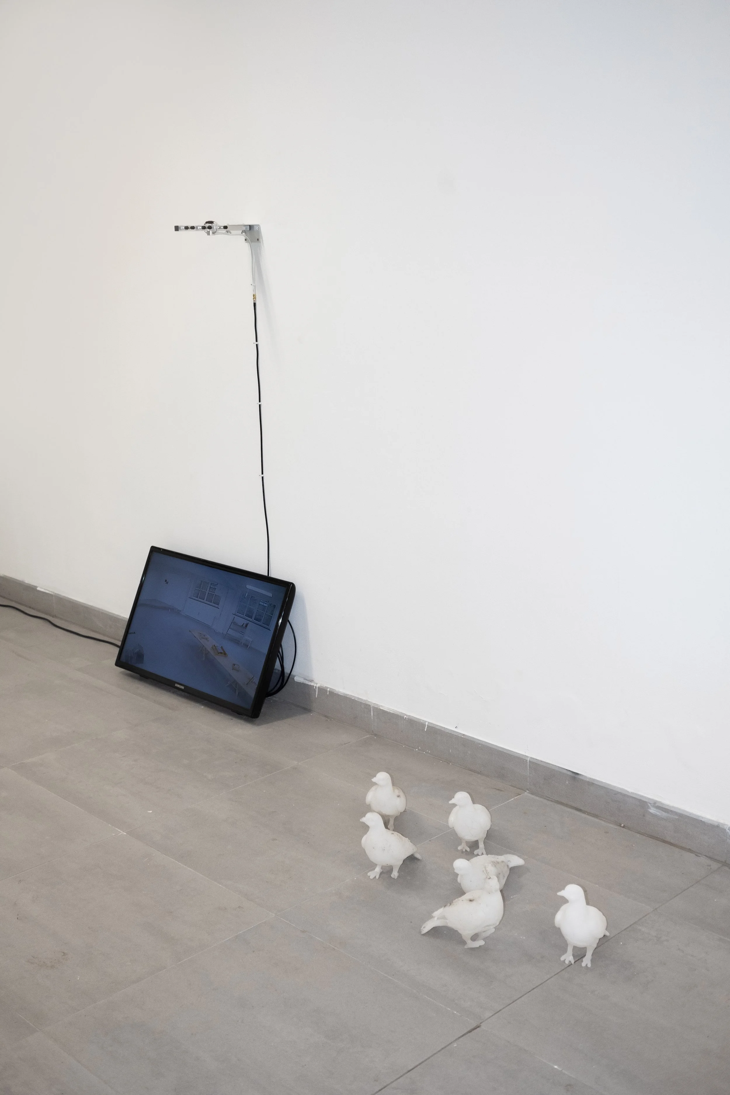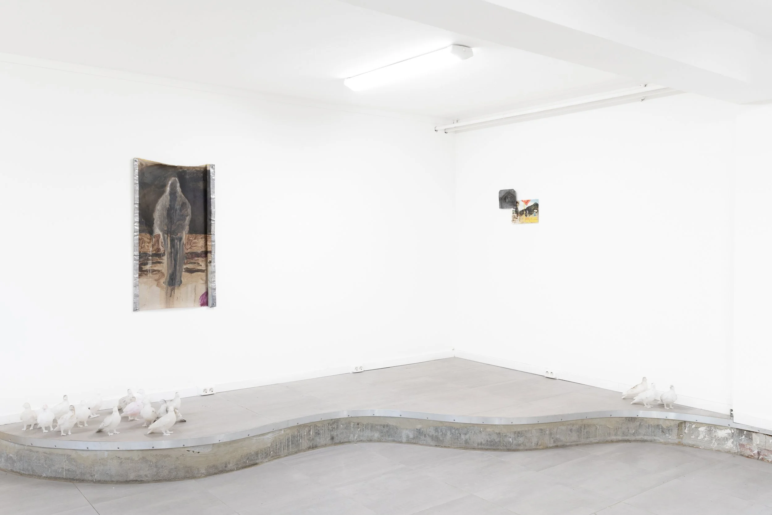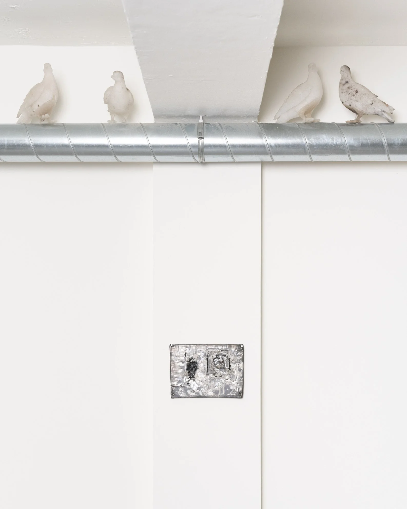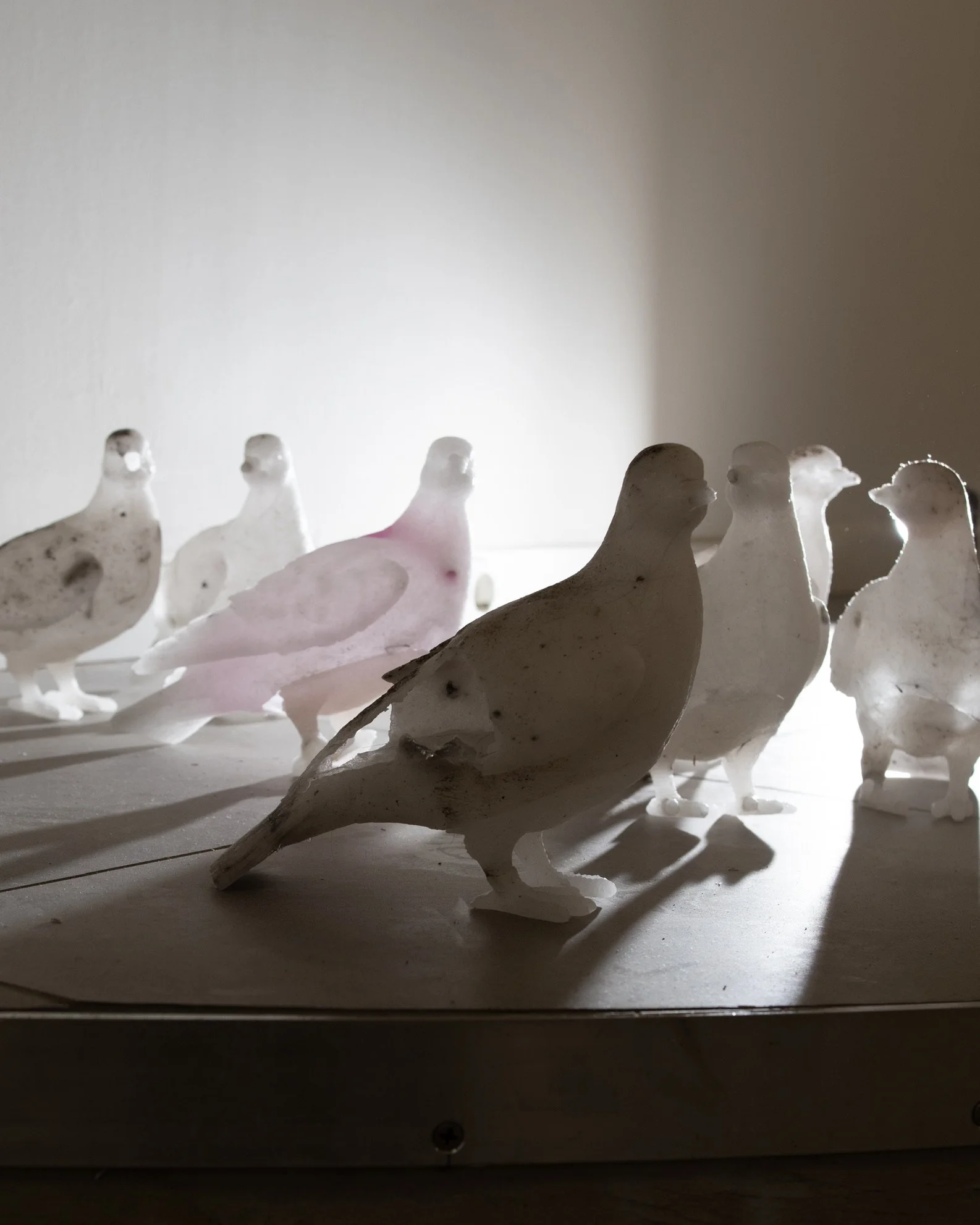 Flock of 50 life-sized pigeons, 2024, wax, dirt of the neighbourhoodImages courtesy of Johan Poezevara