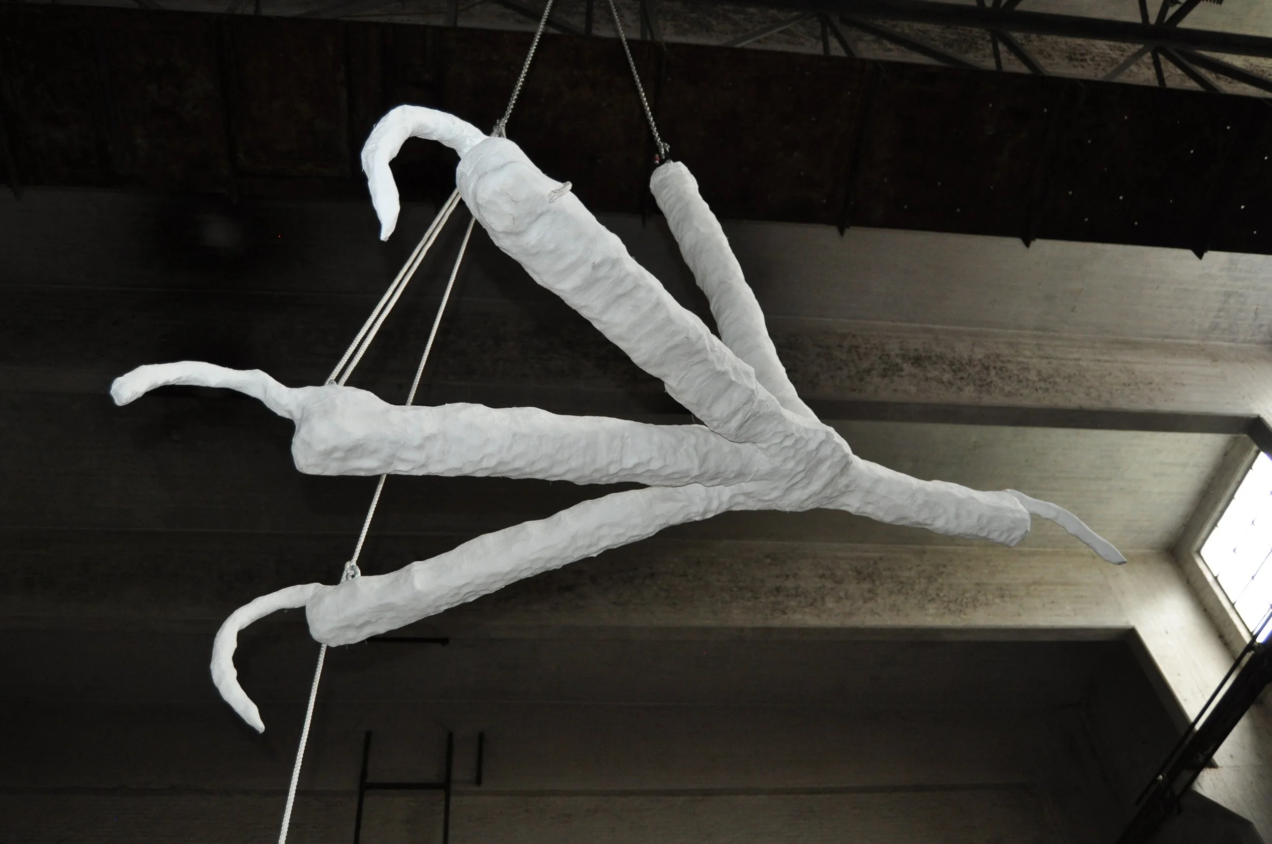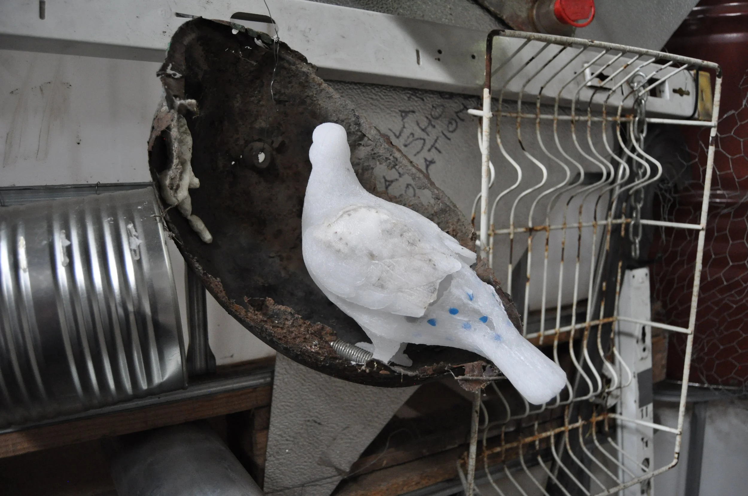 Flock of 50 life-sized pigeons, white paraffin wax, dirt