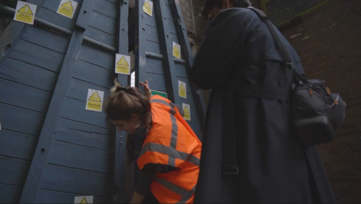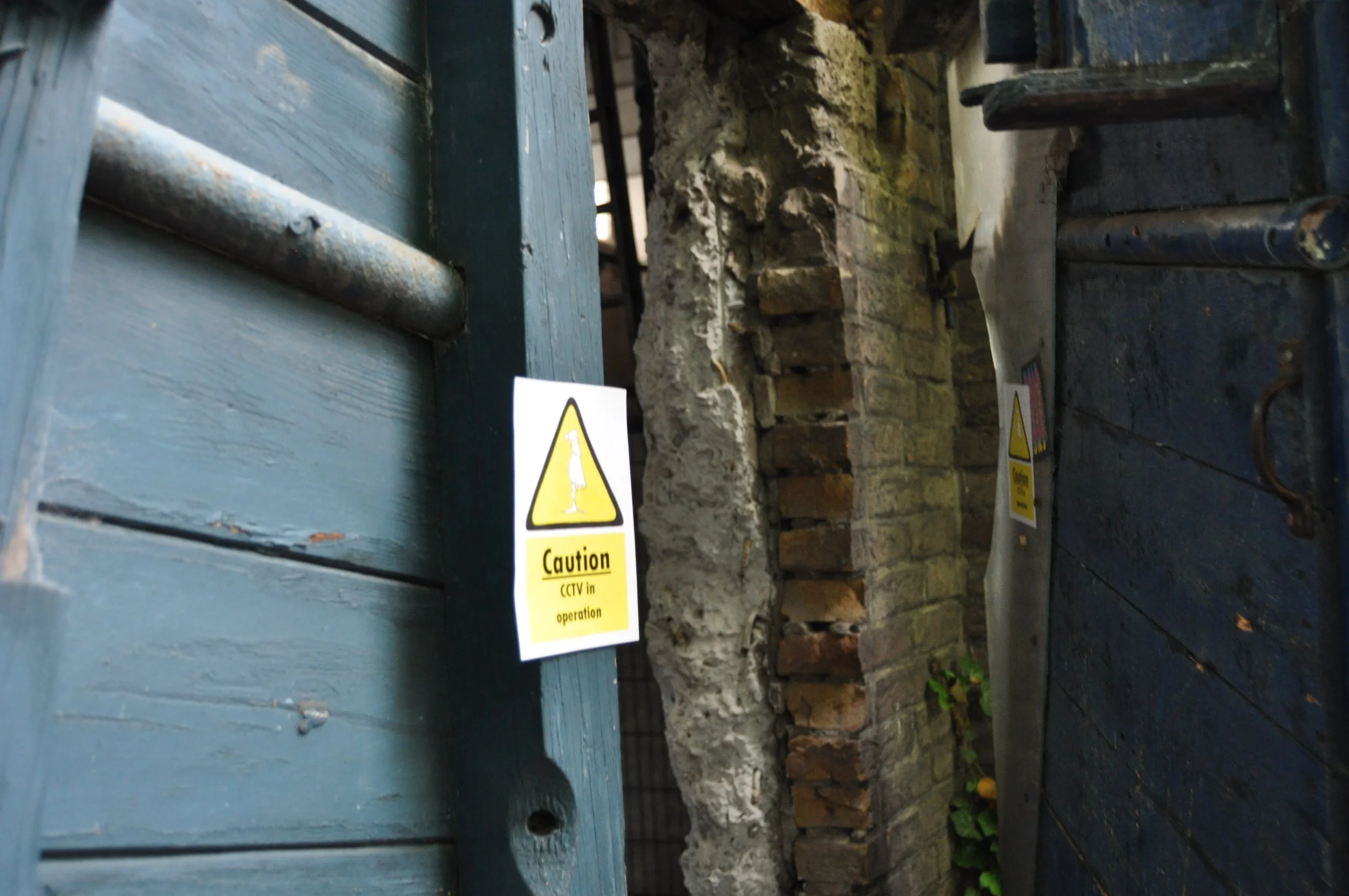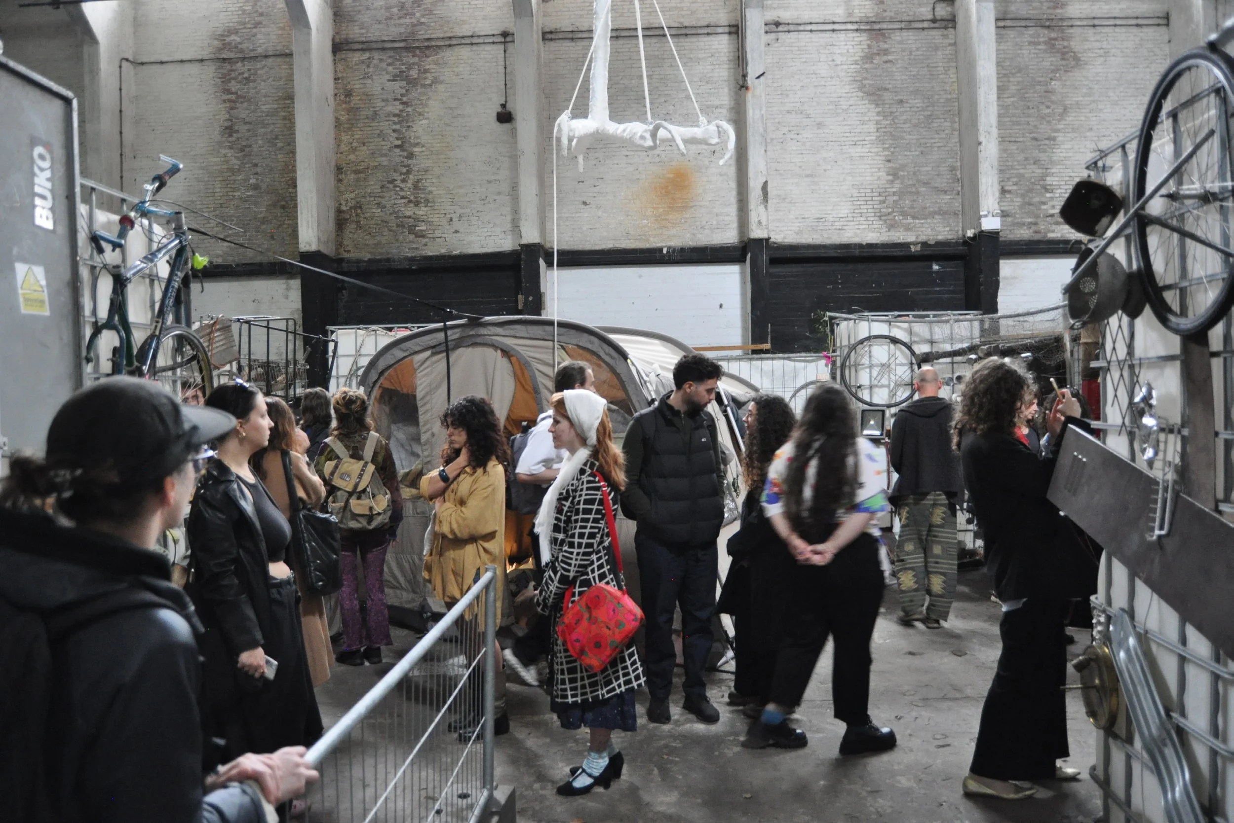 The installation is guarded by a woman in an orange vest. Members of the audience are selected at random - some are permitted to enter upon arrival, others are made to wait for reasons that are not disclosed. We enter through a blue door and find ourselves in a metal enclave - a nest made from scraps of urban human life.