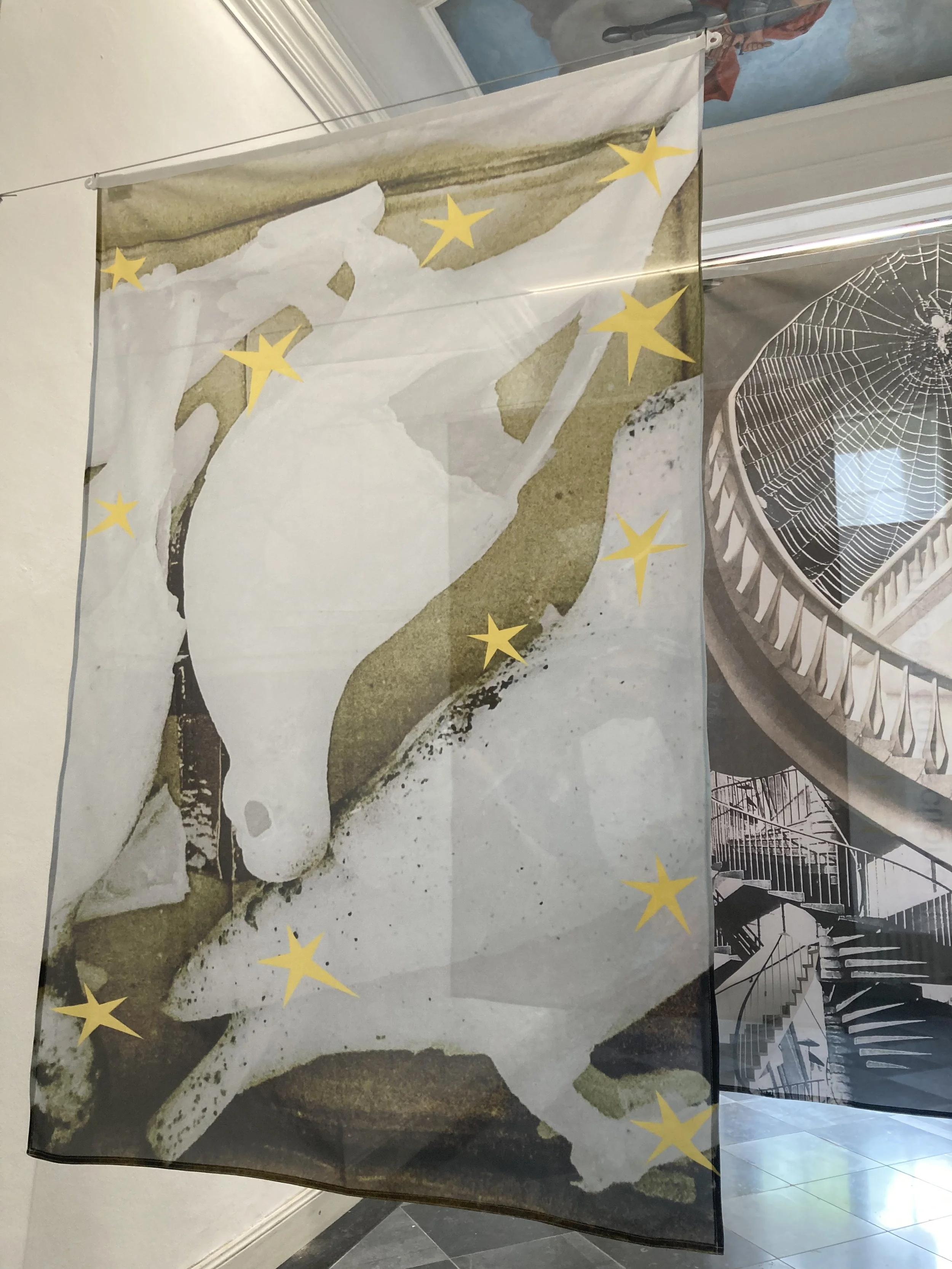We see the circle of stars of the EU flag scattered